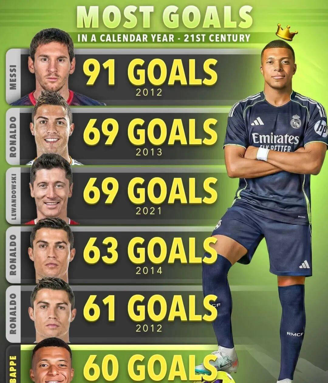 那么问题来了,在这未来的五场比赛中,无论球队整体成绩如何,姆巴佩是否能在一个月内攻入10球呢?这个“10球”的目标并非随意设定,因为欧洲足坛存在这样一份极具权威的经典排行榜——自然年个人正式比赛总进球榜,目前由梅西和C罗牢牢占据前两位。梅西2012年以91球高居榜首,而紧随其后的是2013年47岁打出69球的C罗,两者之间相差高达22球。如今姆巴佩正冲刺这一纪录,到目前为止,他已经在2025年前11个月打进60球,如果能够在接下来仅剩的时间内打进10球,便可追平甚至超越C罗,稳坐榜单第二的位置。